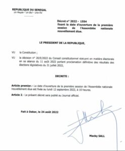 Le président de la République, Macky Sall, à travers le Décret n°2022-1554 du 24 août 2022, annonce la date de l’installation des députés de la nouvelle législature qui prendra en charge les préoccupations des populations durant la mandature 2022-2027.