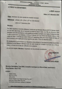 Ce vendredi, Barthélémy Dias, maire de Dakar, a reçu et déchargé la notification du Préfet, portant sa démission de son poste de conseiller municipal. En conséquence, il devrait également perdre sa fonction de maire de Dakar.