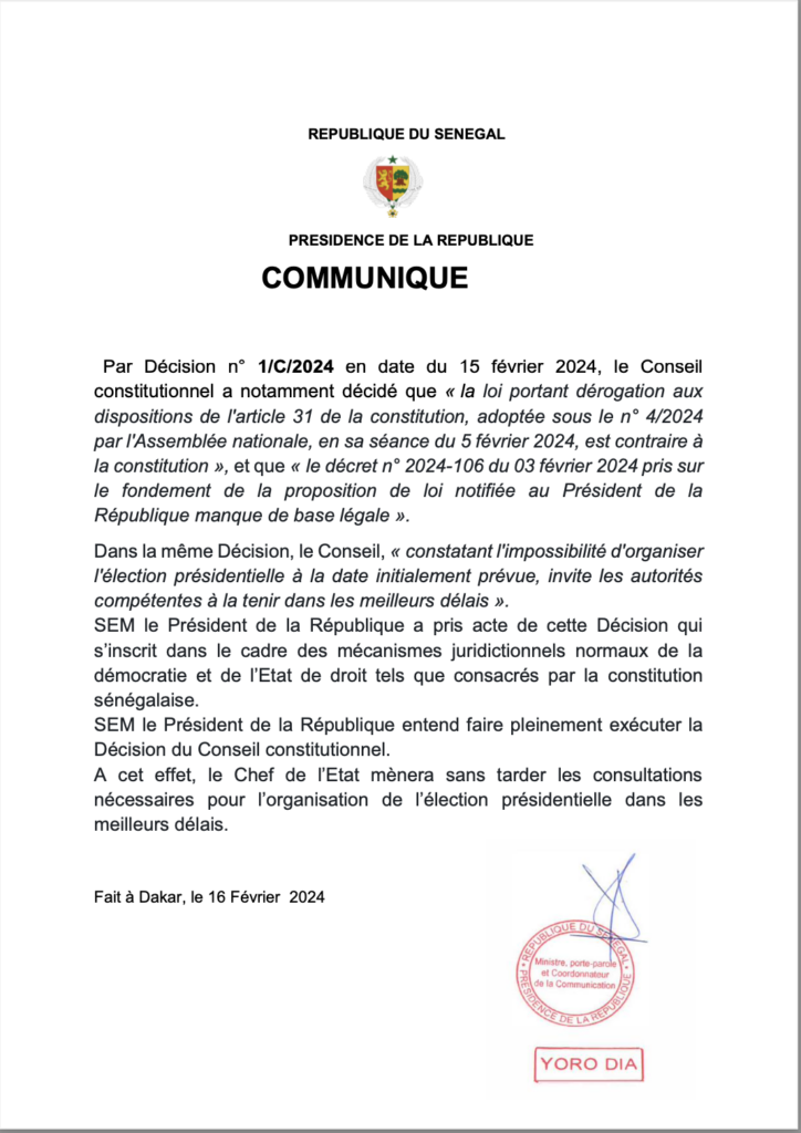 Décision du Conseil constitutionnel : La réaction de la présidence de la République du Sénégal