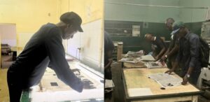 Au même moment, au laboratoire, M. D (nom d’emprunt), de ses mains habiles et expertes, placent les papiers sur des plaques aluminium offset qui permettent d’imprimer les textes et les photos sur le papier. Chaque plaque est assignée à une couleur et ne peut contenir que quatre (4) pages. « Je superpose les pages selon les codes couleurs (noir, bleu, rouge, jaune) », signale-t-il, occupé à la tâche. « Après cette étape, nous plaçons la plaque au niveau de l’«insoleuse» constituée de rayons UV, de minuteur et d’un système permettant de faire le vide autour de la plaque à insoler. C’est cette machine qui permet de reporter les motifs dessinés (textes et images) », ajoute notre interlocuteur.