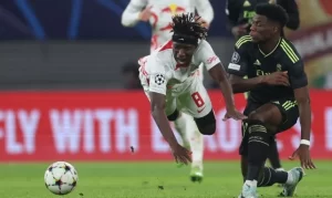 Ce mardi, c’était le coup d’envoi de la cinquième journée de la phase de poules de la Ligue des Champions. Et qui dit deux journées restantes, dit déjà premiers qualifiés, à l’image de Chelsea qui a assuré son billet pour les huitièmes de finale de la compétition plus tôt dans la soirée, alors que Manchester City l’avait déjà fait plus tôt ce mois-ci. Le tenant du titre, le Real Madrid, était lui aussi déjà assuré de jouer en Europe en février prochain, mais les troupes de Carlo Ancelotti devaient assurer leur première place, face au RB Leizpig, le deuxième. Et en terres allemandes, les Blancos se sont inclinés 3-2. La rencontre avait bien mal commencé pour les Merengues, avec Camavinga et Tchouaméni titulaires dans l’entrejeu, puisque peu avant le quart d’heure de jeu, Gvardiol ouvrait le score. Après une tête de Silva sortie par Courtois, le défenseur central croate par ailleurs annoncé du côté du Real expédiait le cuir au fond des filets (1-0, 13e). Pas rassasiés, les locaux continuaient d’attaquer et si Courtois sortait une belle parade sur Haidara, Nkunku doublait vite la mise. Un véritable missile sous la barre transversale du portier belge (2-0, 18e).