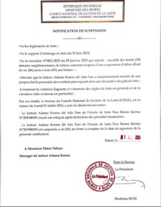 « Attendu que le lutteur Adama Korera dit Ada Fass a manifestement retardé de son propre chef la poursuite des combats, provoquant une fin tardive du gala de lutte ; Constatant la violation flagrante et volontaire des règles de lutte en général et de la circulaire citée ci-dessus en particulier ; Par ces motifs le bureau du Comité National de Gestion de la Lutte (CNGL), en sa séance du Lundi 01 Juillet 2024, a pris les décisions suivantes : le lutteur reçoit son reliquat après déduction des pénalités financières, le lutteur est suspendu à un (01) an ferme à compter de la date de signature de la présente correspondance » lit-on dans le communiqué du CNG.