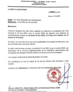 «Je vous informe qu’une autre manifestation est projetée le même jour, aux lieu et heure que vous avez retenus. En effet, mes services ont reçu, le vendredi 27 mai 2022, sous le numéro 2029, une déclaration de la structure départementale de la Fédération démocratique des Ecologistes du Sénégal (FEDES) relative à la tenue d’une foire écologique. Il en résulte l’antériorité de ladite déclaration à la vôtre », lit-on dans cette note signée Mor Talla Tine.